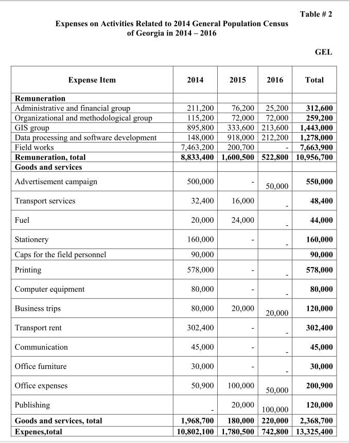 Данные приведены из презентации грузинской переписи 2014 года. И вот в картину 2.2 доллара на человека Азербайджан неплохо укладывается, тогда расходы выглядят адекватно. Это имплицитно доказывает, что реальная численность населения Азербайджана как раз и находится максимально близко к 6 миллионов 180 тысяч человек, как я и считал. Вообще, чтобы представить, на что идут расходы по переписям населения, можно взглянуть на пример Грузии (2014), где достаточно прозрачно и подробно эти цифры представлены.