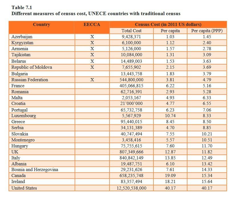 Таблица стоимости переписей взята из доклада UNECE “Measuring population and housing in Eastern Europe, Caucasus and Central Asia: Review of practices in the 2010 round of censuses” (стр. 34).