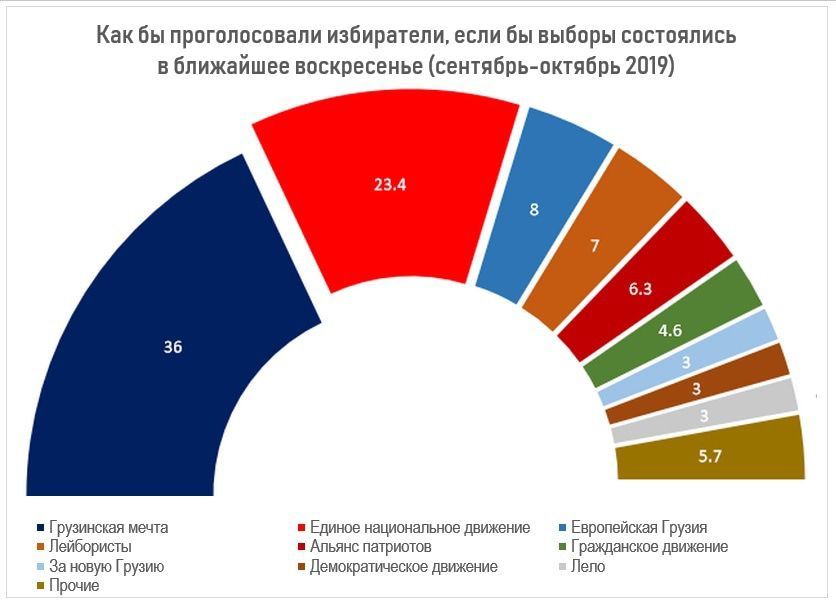Среди оппозиции – на первом месте бывший спикер парламента Давид Бакрадзе, один из лидеров партии «Европейская Грузия». Его одобряет 57% избирателей, хотя во многом этот образ нейтральный, поскольку он не прошел испытания выборами в прошлом году. Изначально имевший определенный рейтинг, он пришел третьим и набрал всего 11% голосов. У Давида Усупашвили уровень одобрения 47% и этот рейтинг также во многом нейтральный, трансформировать его в голоса будет невозможно. Григола Вашадзе, также участвовавшего в президентских выборах, положительно оценивают 41%, Нателашвили (лидер «Лейбористов») – 39%, Мелиа – 34%, Бурджанадзе – 31%, Угулава 31%, Мамука Хазарадзе – 29%, Ирма Инашвили – 29%. Самый отрицательный рейтинг – у Зураба Джапаридзе из «Гирчи», призывавшего легализовать марихуану и устраивавшего непристойные акции на линии соприкосновения. Его поддерживают 14%, против 66%.