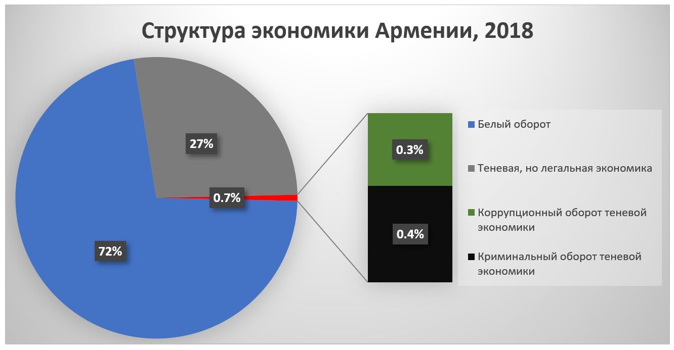 Согласно статистике преступности Армении, в 2018 году суммарный ущерб, нанесенный государству, физическим и юридическим лицам, в результате преступлений, составил 21.92 млрд драм или 45 млн. долл., из которых большая часть приходится на административные, в том числе, экономические и коррупционные, а не криминальные преступления. Однако здесь речь идет о зарегистрированном обороте, какая-то часть, естественно, проходит мимо внимания правоохранительных органов.