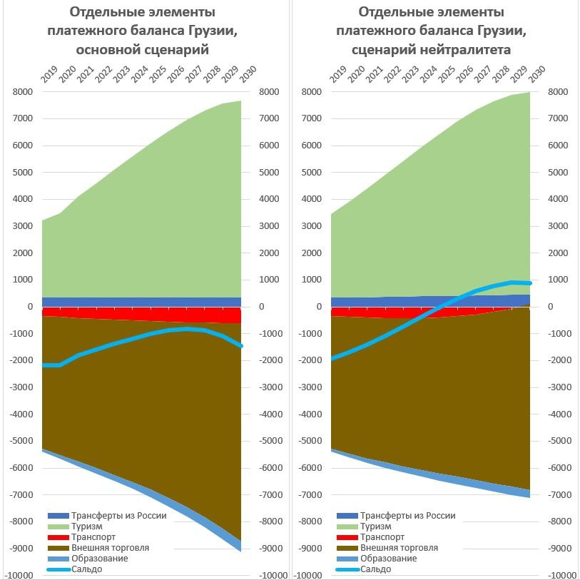 Я рассмотрел влияние притока частных трансфертов из России, доходов от туризма, транспортные услуги, внешней торговли и образовательных услуг на платежный баланс Грузии. Вышло следующее: уже за год разница могла бы составить почти полмиллиарда долларов (в первую очередь благодаря туризму). Впоследствии, эффекты бы нарастали и стали бы очень заметными к концу десятилетия.