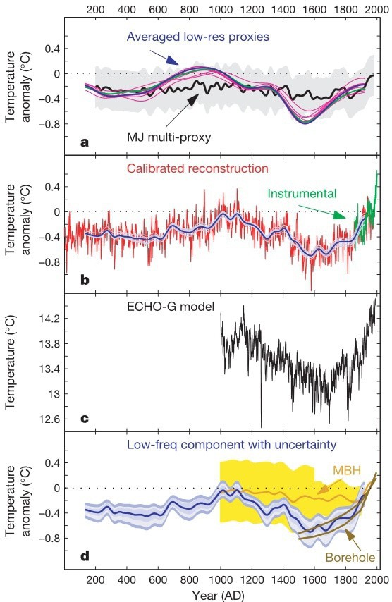 Рис 3. Реконструкция динамики исторических температур в Северном полушарии, на основании косвенных данных