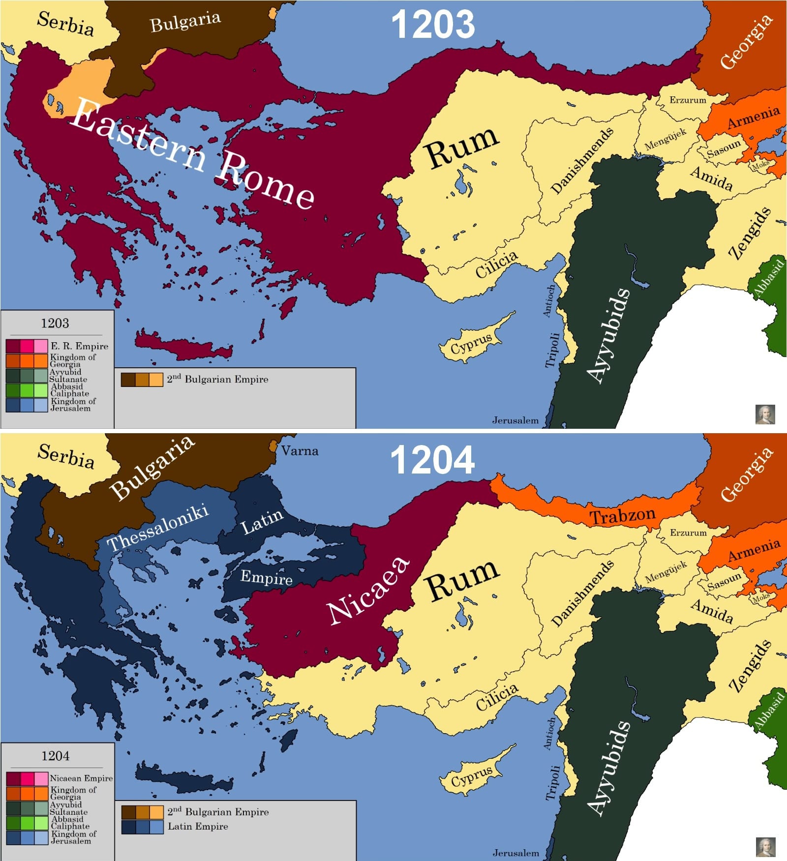Теперь вспомним историю и поместим это событие в исторический контекст. К концу XII века Восточная Римская империя была на подъеме, а сельджуки начали уступать. Византийцы вернули контроль над западной частью Малой Азии. Сама Восточная Римская империя долгосрочно все равно была в процессе ослабления, в том числе по внутренним причинам, но этот процесс еще можно было обернуть вспять. Но в 1204 году крестоносцы захватили Константинополь и округу и поставили своей целью максимальное извлечение прибыли в счет долгов и ради обогащения. Тем самым они «высасывали» остатки ресурсов из города и округи. Также они «обваливают» византийцев и Румский султанат получает возможность расшириться и заметно усилиться.