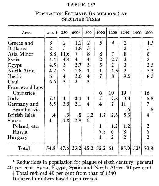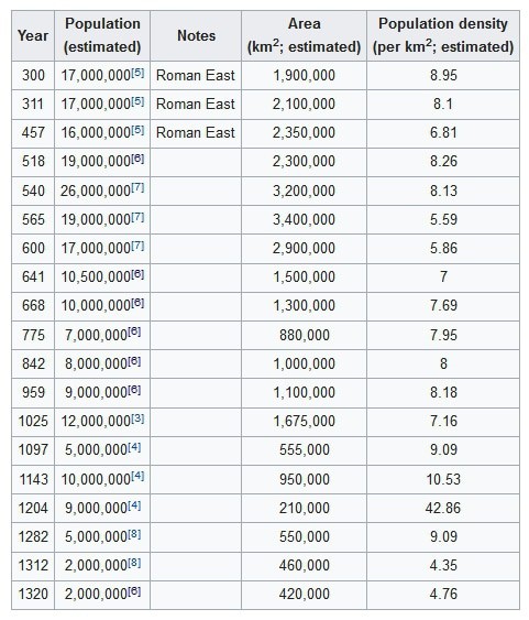 Теперь необходимо оценить, насколько большим было демографическое давление столицы на всю империю. Для этого нам нужно знать численность населения империи, а также ее столицы на разные промежутки времени. Данных по этому поводу не так много, также спорна их точность. Например, Josiah Cox Russell в своей книге “Late Ancient and Medieval Population” приводит следующие оценки:
