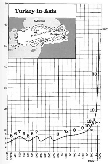 Для коррекции размерности данных у нас есть оценки Колина Мак Эведи и Ричарда Джонса из Атласа мировой демографической истории. Эти оценки довольно неплохи в определении примерной численности населения региона в Средние века, но очень неточны, если рассматривать сравнительно краткосрочную динамику. Ниже приведена страница из книги с динамикой населения Малой Азии, включая Западную Армению. Если кто хочет увидеть эти оценки по разным странам в сопоставлении, они приведены на одном из сайтов на народ.ру.