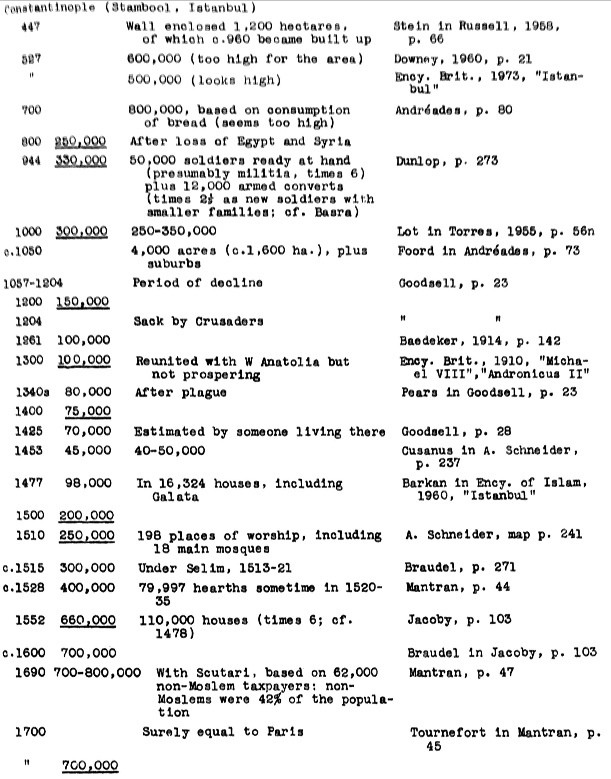 Осталось обратить внимание на столицу – Константинополь. Достаточно точных и регулярных данных у нас нет. Но кое-что все-таки есть. Это оценки, собранные Tertius Chandler в его книге «3000/4000 (2 изд) лет роста городов». Там он приводит следующую таблицу по Константинополю:
