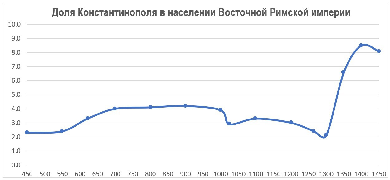 Рис 7. Оценка доли Константинополя в населении Восточной Римской империи