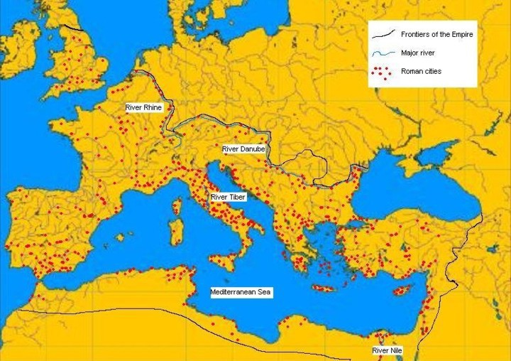 В Римской империи, также, как и в любой другой империи, города могли достигать довольно больших размеров. Это было связано с тем, что сельская провинция «содержала» города, по крайней мере, с точки зрения обеспечения их продовольствием. И империя могла сконцентрировать ресурсы с отдаленных мест на содержание своих столиц или регионов-метрополий. Так, Римскую империю хлебом снабжал Египет, а в античной Италии уровень урбанизации достигал 30%, тогда как в других регионах империи он не превышал 10%. Это означает, что часть того городского населения, которую содержал тот же Египет, размещалась не в самом Египте, а в Италии. Для наглядности, вот карта размещения римских городов: