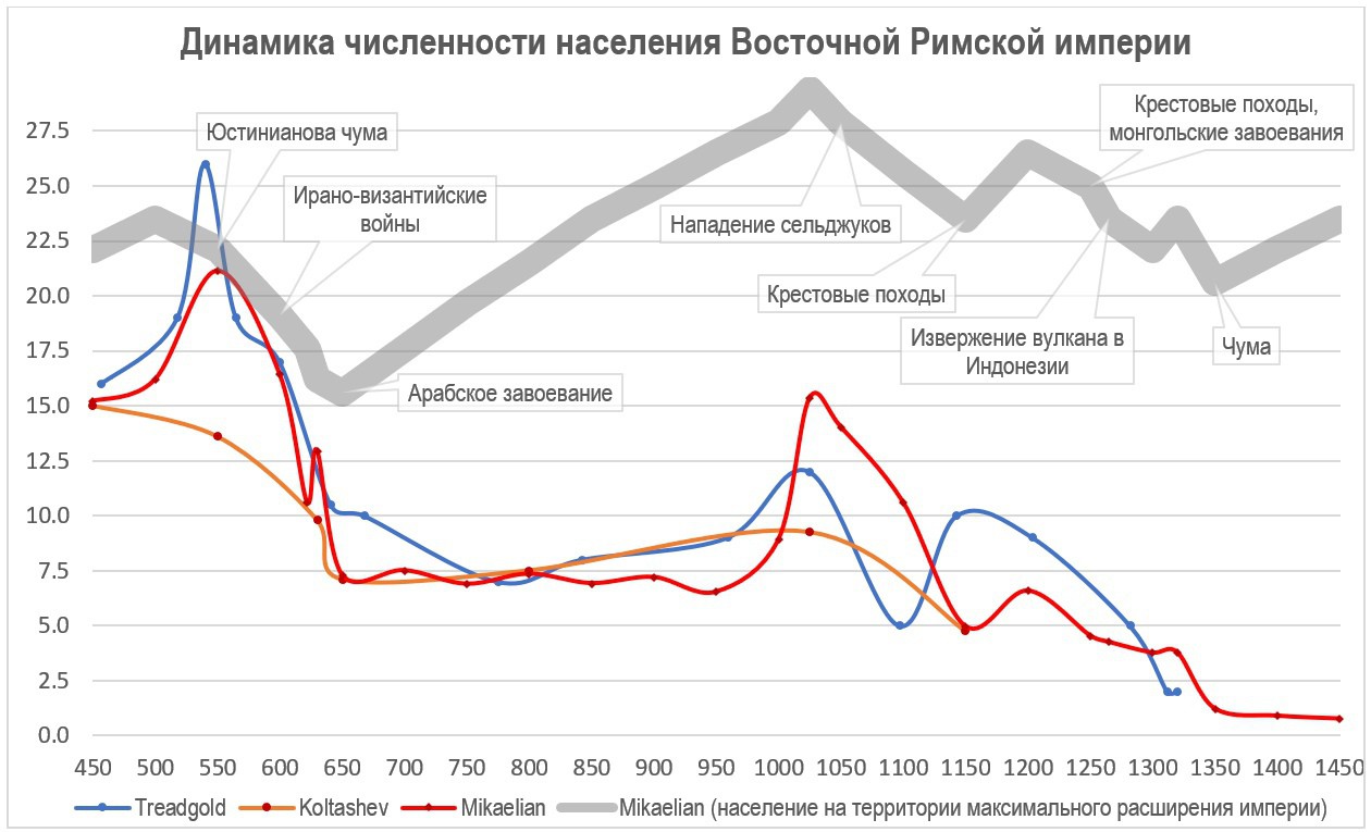 Теперь мы определились со всеми прочими составляющими демографического кризиса, с которым столкнулась Восточная Римская империя в последние века своего существования. Аграрное перенаселение приводило к неизбежному снижению населения при потере территорий. Снижение численности населения в результате совпадения множества неблагоприятных факторов, не привело к снижению числа представителей элиты и, в результате, имело место перепроизводство элит. На этом фоне в Индонезии происходит извержение вулкана и климат меняется настолько, что Эгейское море становится холодным, империя испытывает голод и беднеет. Она теряет территории, но столица - второй Рим - остается в ее составе и доля Константинополя в населении растет по мере потери территорий.