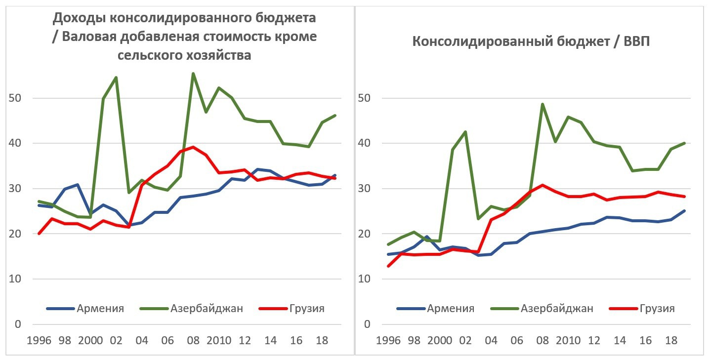 Кроме того, частью ВВП являются налоги на продукты за вычетом субсидий (что приводит к двойному счету) и косвенно измеряемые услуги финансового посредничества (отрицательные по знаку). Также, учтем, что Армения в 2015 году (и задним числом – с 2012) перешла на СНС-08, в результате чего объем ВВП вырос, а соотношение упало. Грузия перешла на СНС-08 в конце 2019 года и данные по СНС-93 еще доступны. См. также ВВП на душу населения стран Южного Кавказа. Обогнала ли Армения соседей? (8 января 2020).