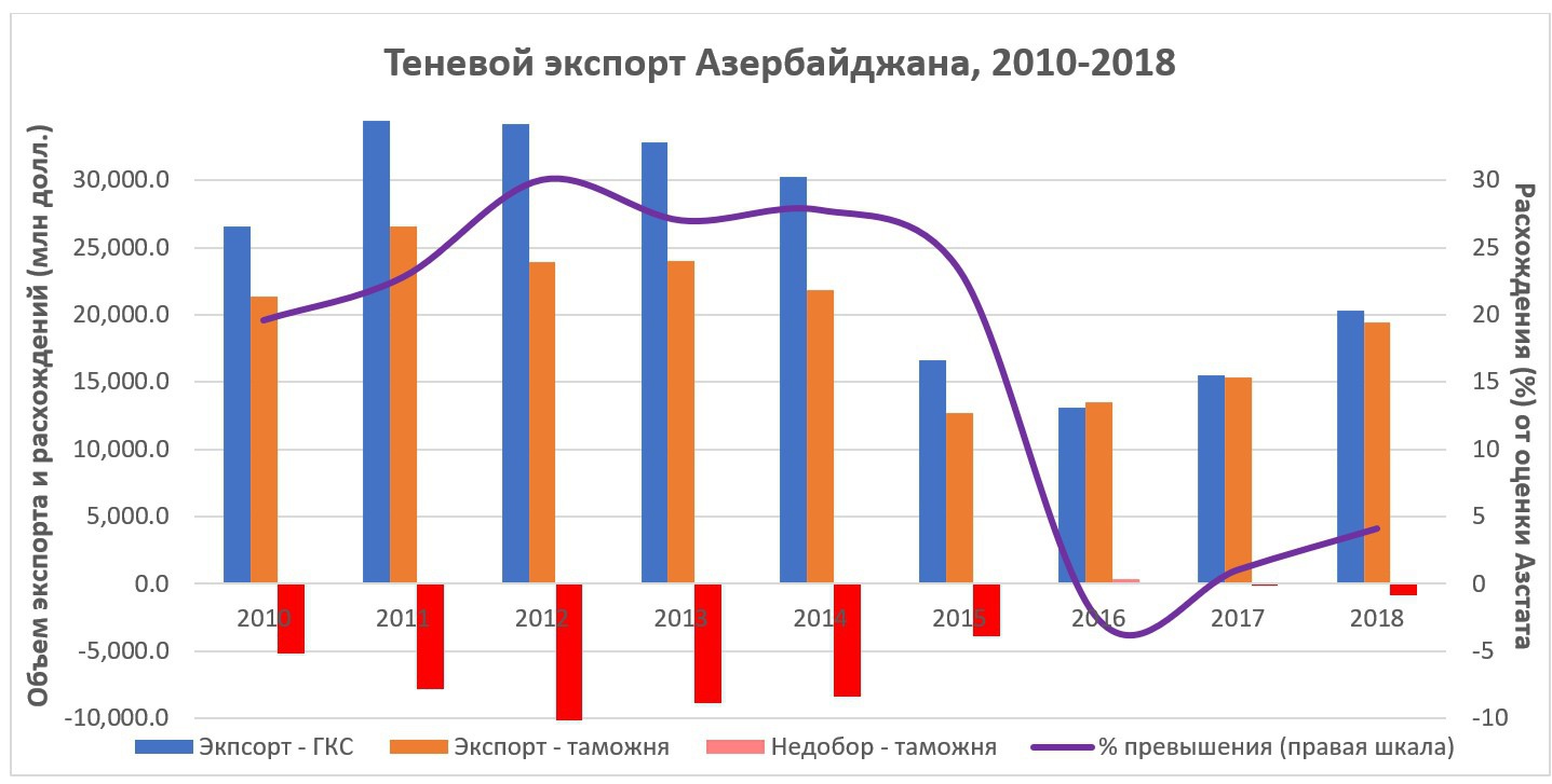 Мы уже увидели, что часть реэкспорта Грузии – по сути реэкспорт теневого сектора Азербайджана и Армении. В случае Армении это наблюдалось до 2004 года, а в Азербайджане – вплоть до 2015 года. Интересно, что начиная с 2010 года Азербайджан собирает два вида статистики по экспорту – одна – оценка таможенными органами, а другая – оценка статистического комитета. Так вот, вплоть до 2015 года экспорт по данным статистического комитета был существенно больше, чем по данным таможенной службы, что позволяет говорить о том, что государство само признает теневой экспорт из Азербайджана. Представим сопоставление этих расхождений.