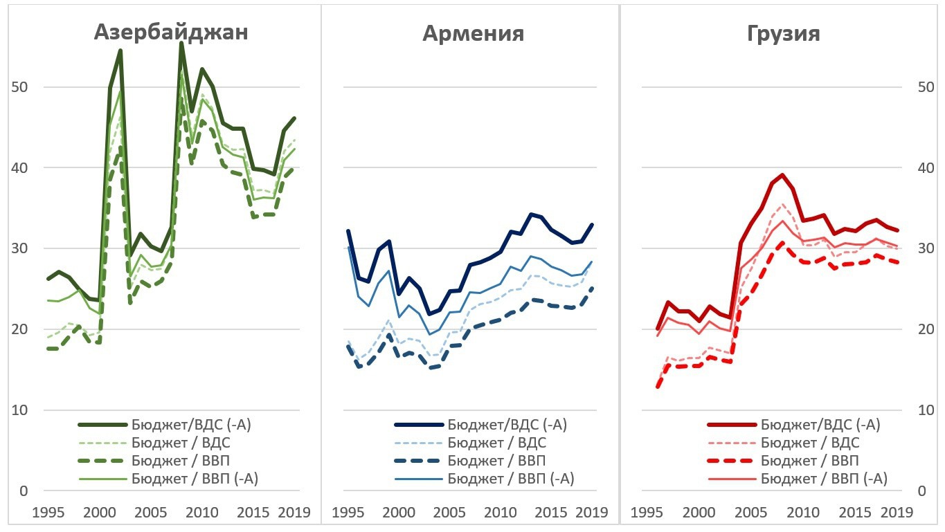 Из графика 5 отчетливо видно, что в Азербайджане соотношение доходов бюджета и показателей национальных счетов устойчиво росло на протяжении всего периода независимости, в Армении оно сначала снижалось, а потом (в том числе сейчас) – росло, а в Грузии имелся резкий рост в период Саакашвили, после чего снижение и стабилизация. Причем снижение произошло еще при Саакашвили, а стабилизация – на уровне позднего периода власти Саакашвили. Это отражает то, как сильно снизилась теневая экономика при Саакашвили, но в какой-то момент власти решили ослабить фискальное давление, поскольку оно было чересчур сильным. Кроме того, в бюджете оседали доходы от внешней поддержки и транзита. Они, хотя и не были определяющими, но некоторое влияние все же оказывали.