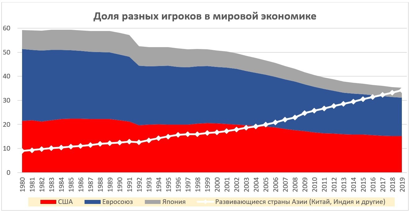 В первой части уже сказано о том, что развитые страны больше не могут в одиночку решать сколько-либо серьезные проблемы, а эксклюзивные институты, такие как G7 и многие другие, ослабли. Центр тяжести цивилизации смещается на юг и восток. Доминирование в мировой экономике и политике США, Японии и Евросоюза заканчивается, но ответственных альтернативных игроков пока нет. Россия и Китай претендуют на эту роль, но пока их поведение скорее эгоистично, что не позволяет претендовать на роль полноценного глобального полюса, даже если ресурсы это уже позволяют (что также спорно). Изменение экономических «весов» показано на графике ниже.