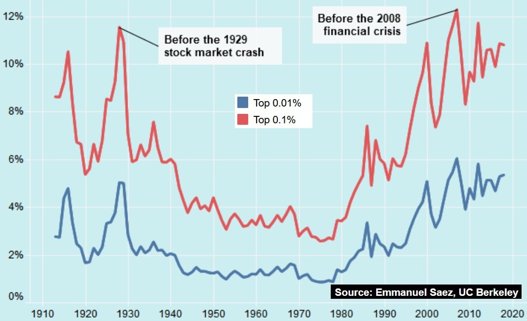 Динамики неравенства в США – доля самых богатых в доходах всего населения (Inequality.org), в исторической перспективе также интересна ситуация в России (см. график 8b), где сейчас уровень неравенства выше, чем в 1905 году. Отличается ситуация в Европе, особенно заметны изменения в Великобритании, где наоборот доля имущества элиты заметно сократилась, хотя в последние годы рост заметен и там. (см. доклад о глобальном неравенстве – 2018, график Е8)