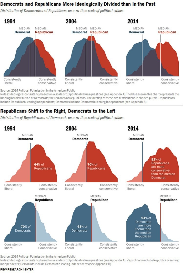 Рост поляризации между политическими партиями США между 1994 и 2014 гг. (см. Pew Research Center) Стоит учесть, что после 2014 года поляризация в США еще больше выросла. (см. Gallup). На графике мы видим, что в 2014 году избиратели партий серьезно размежевались по политическим углам – более 90% демократов либеральнее среднего республиканца и более 90% республиканцев консервативнее среднего демократа.