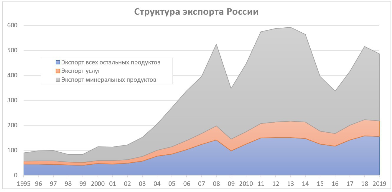 Взглянем на внешнюю торговлю. Если в ВВП сырьевой сектор составляет 12-14%, то это, пусть и значительное, но не определяющее влияние. А вот во внешней торговле оно куда выше: большая часть добываемой в России нефти экспортируется. На протяжении 2008-2014 гг. нефтегазовый сектор составлял порядка 70% в товарном экспорте России, а с 2015 года доля нефтегазового сектора снизилась и колебалась в интервале 60-64% от всего товарного экспорта. Экспорт услуг не очень большой, но для получения адекватной картины следует учесть и его. Тогда доля сырьевого экспорта снизится до 57% в 2018 г. и 55% в 2019 г., что много.