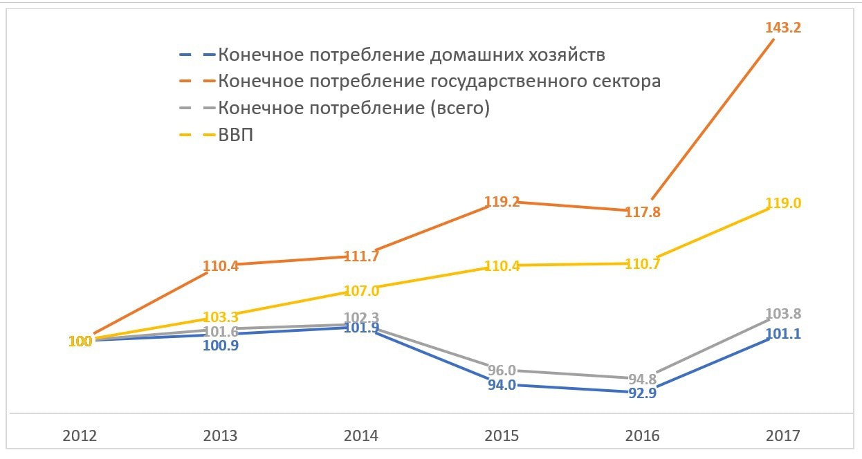 График 4. Дивергенция ВВП и конечного потребления на примере Армении в 2012-2017 гг. (2012=100)