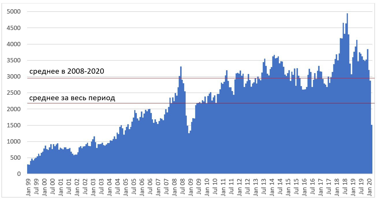 За неделю с 14 по 20 марта международные резервы Российской Федерации сократились почти на 30 миллиардов долларов, а это вдвое больше, чем на пике кризиса 2014 года и соответствует уровням 2008 и 2009 года. При этом, в отличие от того периода, сейчас далеко не пик кризиса, который будет не раньше, чем через месяц. С такими темпами резервов не хватит даже на полгода. Так что несмотря на то, что Россия более устойчива, ее финансовая устойчивость не бесконечна и сейчас будет проходить тяжелейшее испытание на прочность.