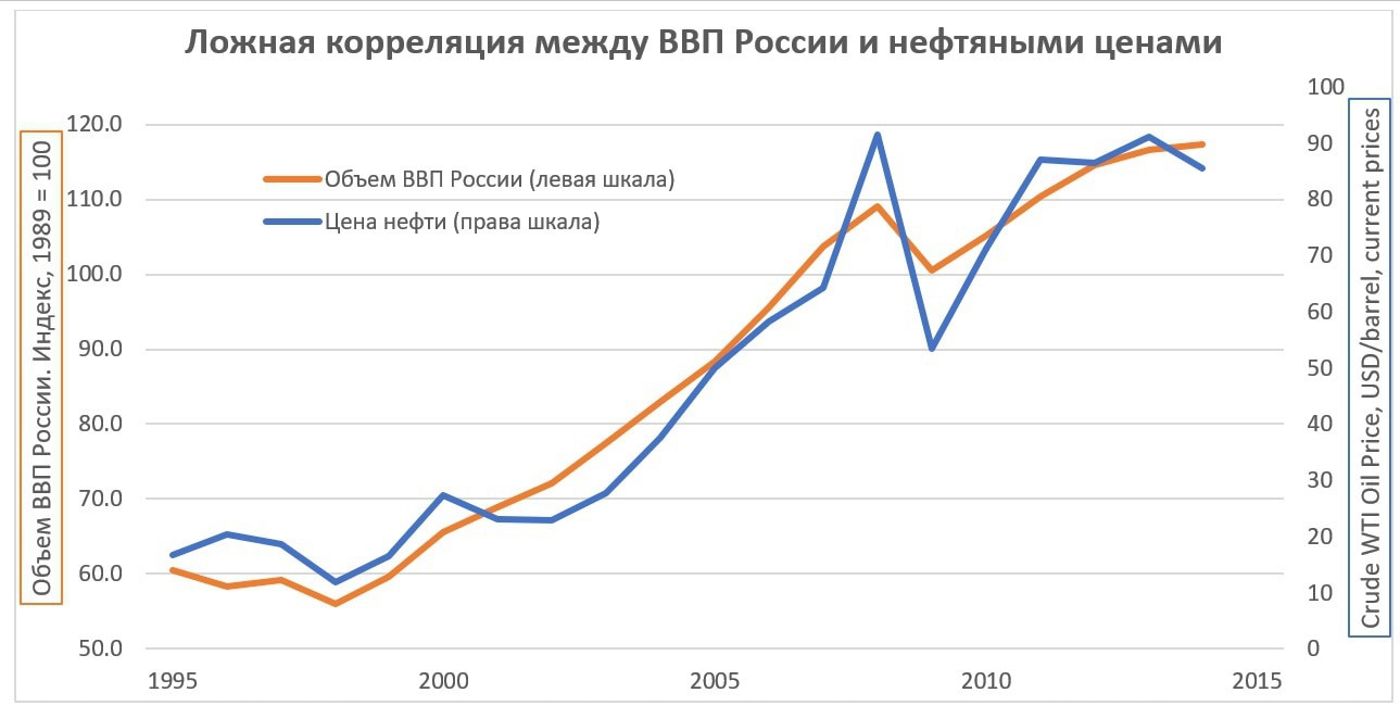 При этом, объем ВВП России может быть практически неизменным. В частности, ВВП измеряется в сопоставимых ценах, тогда как нефтяные цены в текущих. То есть сравнение нефти и темпов роста валового внутреннего продукта России уже неадекватно, поскольку они несопоставимы. Конечно, и текущие цены влияют на валовый внутренний продукт, поскольку позволяют финансировать государству ту или иную деятельность в большем объеме, так тот же объем проданной нефти приведет к разному объему инвестиций в национальные проекты, как следствие потребление и производство тоже растет. И падает, когда нефтяные доходы сокращаются. Но влияние это все-таки не очень значительно. Чтобы это скомпенсировать нужно, по меньшей мере, уточнить нефтяные цены исходя из инфляции доллара. Иначе можно получить недоразумение, свидетельствующее о прямой связи.