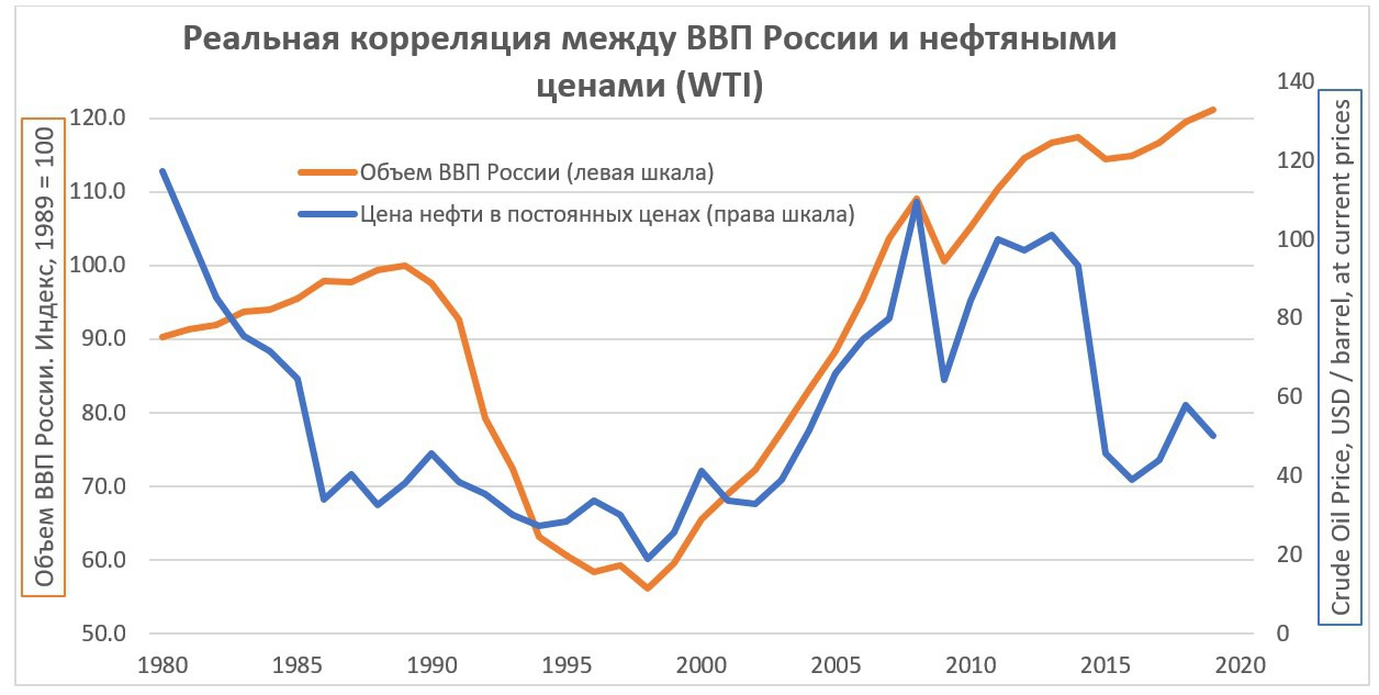 Но это статистический мираж. В действительности, период в 20 лет недостаточен и надо смотреть на более длинные интервалы и корректировать цены на инфляцию, точно так же как скорректирован на инфляцию ВВП и тогда выходит совершенно другая картина. Также не стоит забывать о том, что совпадение графиков во многом случайно, поскольку российская экономика в 1990-ых гг. падала от смены экономического уклада и разрыва хозяйственных связей в куда большей степени, чем из-за низких цен на нефть, которые, кстати, не были такими уж катастрофичными, за исключением 1998 года, конечно. А на мировом нефтяном рынке в это время тоже был период низких цен и это напрямую не связано с Россией. Чтобы было еще яснее, скажу, что если бы цена на нефть в 1994 году была вдвое выше, то ВВП не был бы вдвое выше. Корректный график выглядит так.