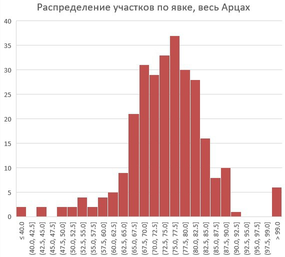 У Виталия Баласаняна распределение участков выглядит близким к нормальному, следов искусственного влияния незаметно, так что это распределение вставлять смысла нет. Итого, можно сказать, что нарушения, зафиксированные избирателями, видны и на распределении. Но эти нарушения не носили тотального характера, хотя и повлияли на конечный результат в виде некоторого изменения соотношения голосов между Арутюняном и Маиляном, вероятно на ~3% в пользу первого.