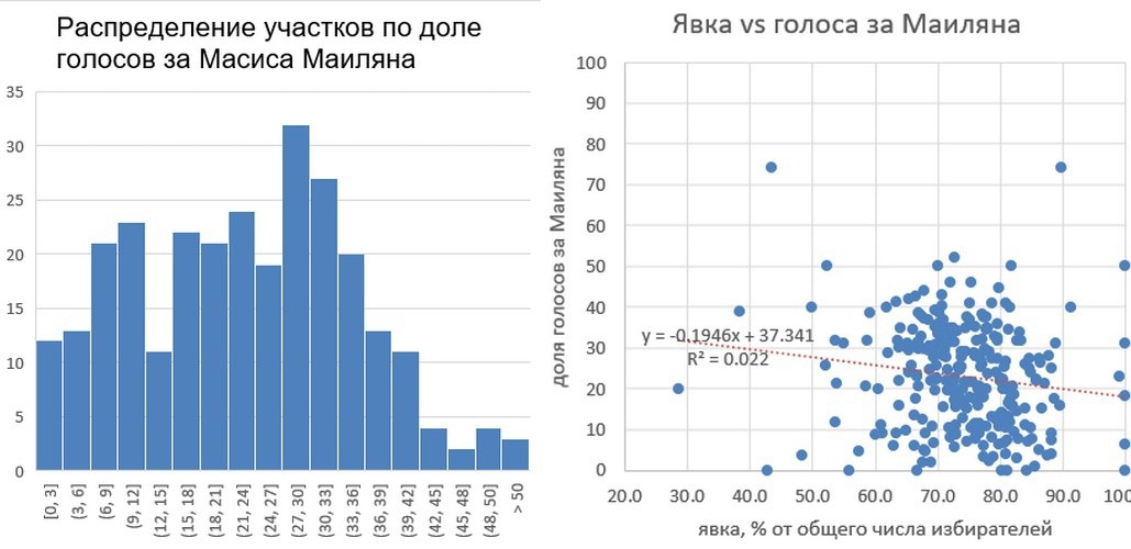 Здесь число голосов «за» снижается по мере роста явки, а левая часть распределения смещена в сторону нуля. Учитывая, что многие участки мелкие, это может ничего не означать, но скорее всего можно предположить переброс или признание недействительными части голосов за Маиляна.