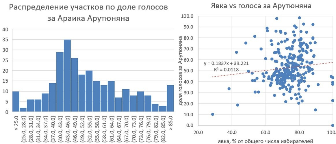 Здесь видна положительная корреляция с явкой и очень длинный хвост в конце распределения. Это означает, что при повышении явки непропорционально росло число голосов за Араика Арутюняна.