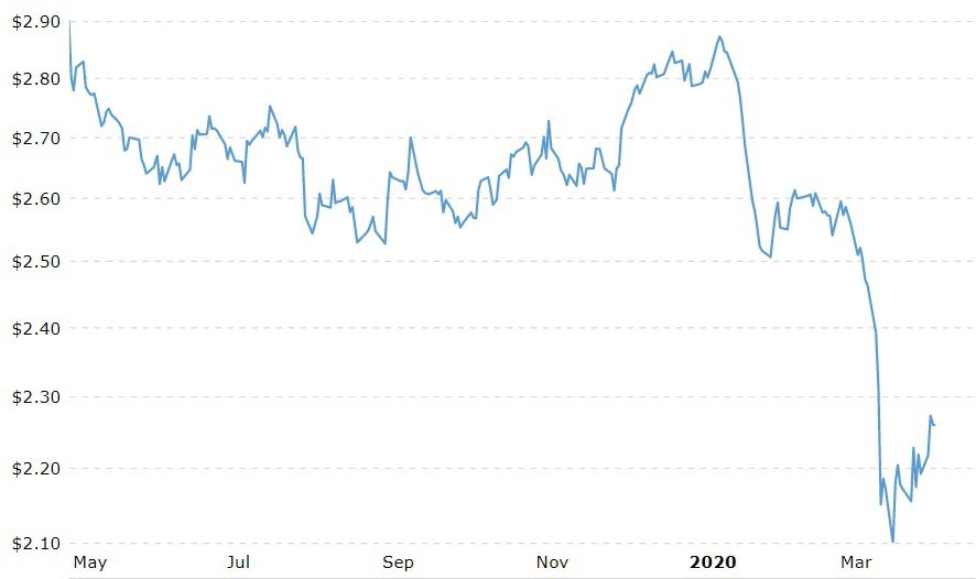 Динамика ежедневных цен на медь (источник: Macrotrends.net).