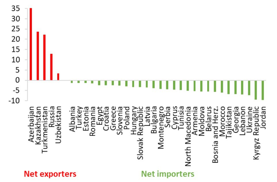 Степень влияния внешней торговли ископаемым топливом на экономику. На графике ниже показан процент чистого экспорта (в случае отрицательных показателей – импорта) нефти и газа в ВВП. Азербайджан на первом месте во всем регионе и его зависимость примерно в три раза выше, чем зависимость России. Армения и Грузия – нетто-импортеры энергии. На них колебания цен на нефть скажутся положительно, хотя и не очень сильно, поскольку собственно нефть ни Армения, ни Грузия не покупают, а нефтепродукты в цене не столь волатильны.
