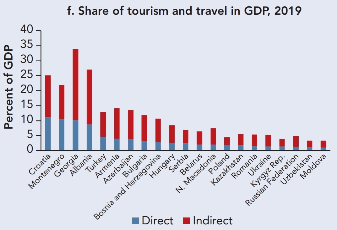 Но самой большой неожиданностью для меня, по правде говоря, стала высокая оценка роли туризма для экономик Армении и Азербайджана. Что касается Грузии, то здесь все понятно. Ее зависимость от туризма невероятно высока – не менее 7 миллионов человек в год приезжают в Грузию и почти весь сектор услуг ориентирован именно на них. Но Всемирный Банк в своем докладе “Fighting COVID-19. Europe and Central Asia Economic Update”, эту зависимость оценивает в примерно 34% ВВП на 2019 год, включая 10% - прямая зависимость и 24% - косвенная. А вот по Армении и Азербайджану – прямая зависимость около 4%, а косвенная – порядка еще 10%. Причем для Армении туризм несколько существеннее чем для Азербайджана.