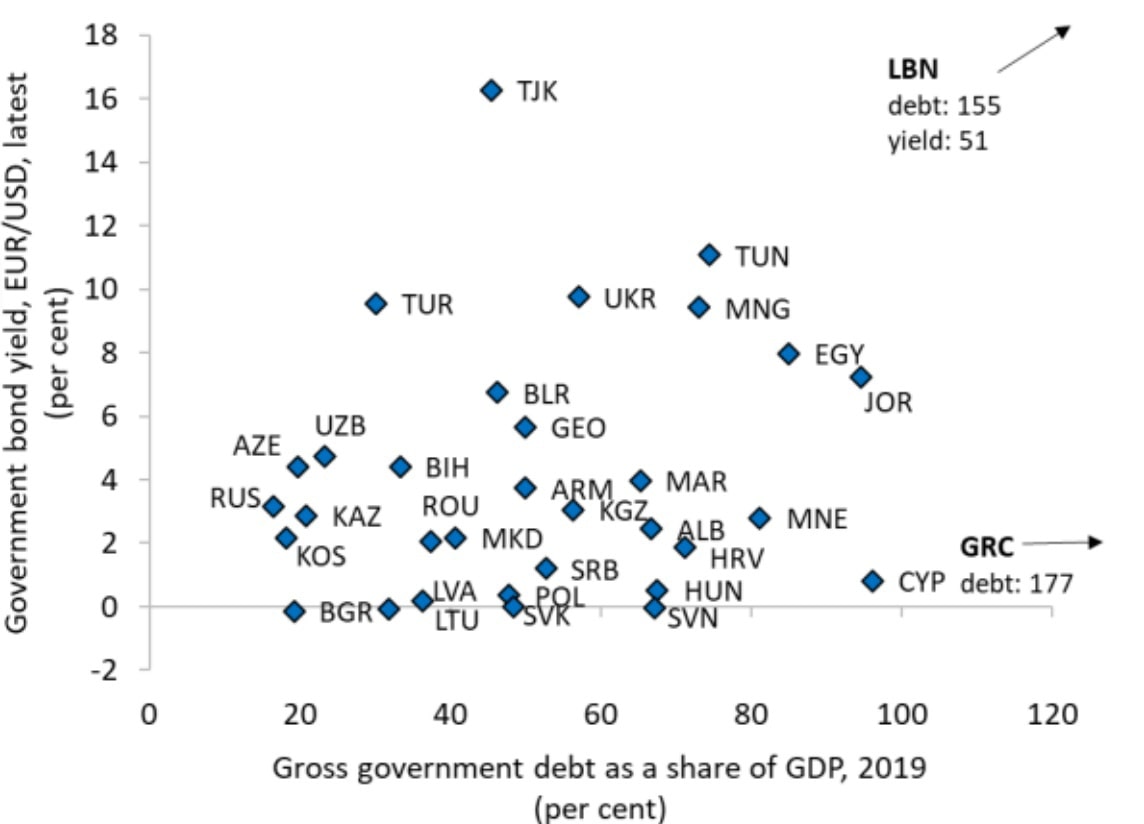 Но при этом, по оценке авторов, Армения может привлекать кредитные средства по самой низкой цене – процентная ставка по армянским бондам – 4%. тогда как у Азербайджана 5%, а у Грузии – почти 6%. Правда, на портале cbonds, эти проценты и для Армении, и для Грузии, выше. На графике ниже – закредитованность (по оси X) и процентные ставки по государственным облигациям (по оси У).