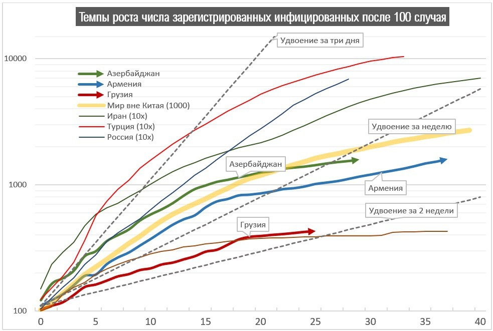 На эту тему мы уже говорили почти неделю назад. Сейчас оценки следующие: Армения и Азербайджан: регистрация случаев отстает от реальности на 7 дней, Грузия – на 3 дня. Факт инфицирования может окончиться смерть в среднем через 19 дней (5 дней инкубационного периода + 14 дней болезни).