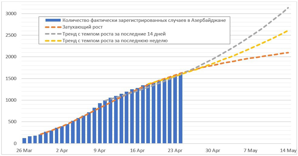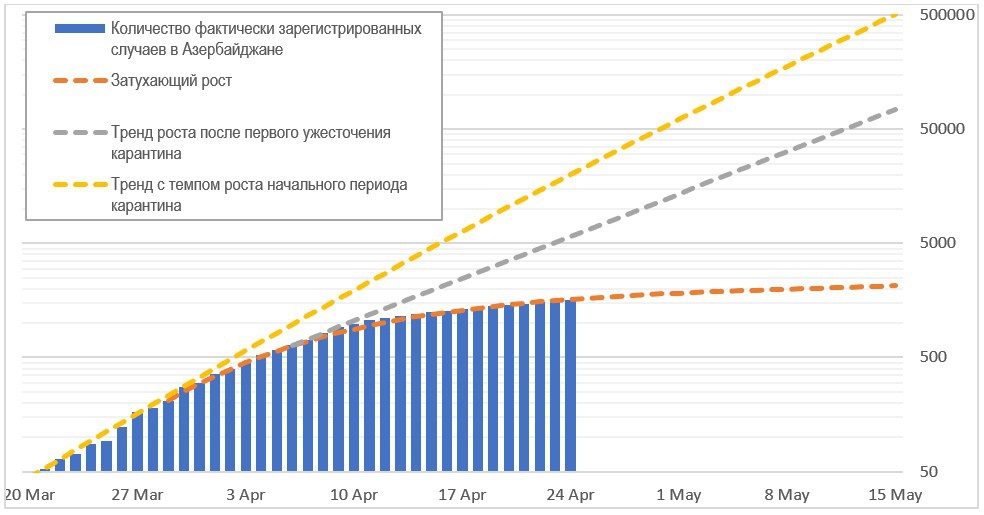 Если сохранится затухающий тренд, то к середине мая в Азербайджане будет зафиксировано около 2100 случаев инфицирования, если учитывать темпы роста за последнюю неделю и они не будут меняться, то 2600, а если темпы роста за последние две недели, то более чем 3100. В условиях мягкого карантина (с середины по 30 марта) продолжение роста к 14 маю довело бы число заболевших до 66 тысяч, а полное отсутствие карантина довело бы число инфицированных уже до не менее полумиллиона.
