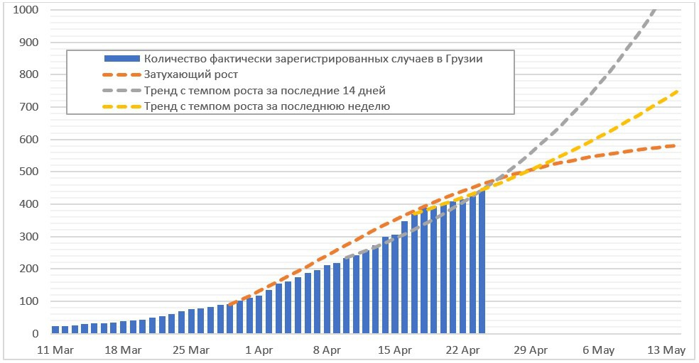 Затухающий тренд показывает порядка 580 случаев к середине мая. Тренд со средним приростом за последние две недели доведет число зарегистрированных случаев до чуть более 1100, а тренд последней недели к середине мая показывает почти 750 случаев. Все эти тенденции умозрительны, так как меняется государственная политика, а она в свою очередь, оказывает серьезное влияние на темпы распространения вируса. Например, в последнюю неделю в Грузии предельно жесткая политика, нацеленная на пресечение распространения коронавируса и сегодня премьер-министр Гахария объявил, что эта политика будет продолжена долго, хотя и медленно будет смягчаться. Это означает, что с наибольшей вероятностью все пойдет по нижнему сценарию, либо по среднему.