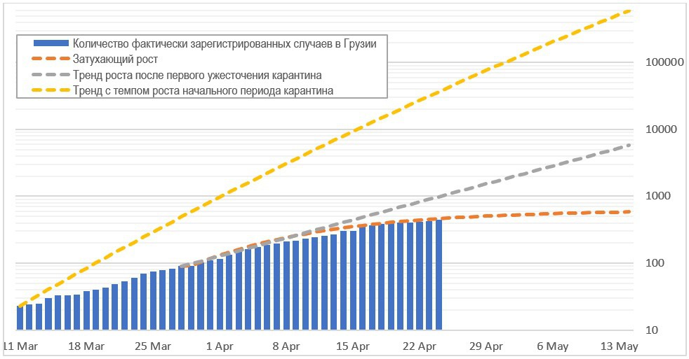 На данный момент в Грузии 431 случай. Безо всякого карантина, было бы порядка 36.5 тысяч случаев на 24 апреля и до 600 тысяч к 14 маю. А при сохранении карантина средней степени жесткости, как на начальном этапе, сейчас было бы 1000 инфицированных и менее 6000 к середине мая.