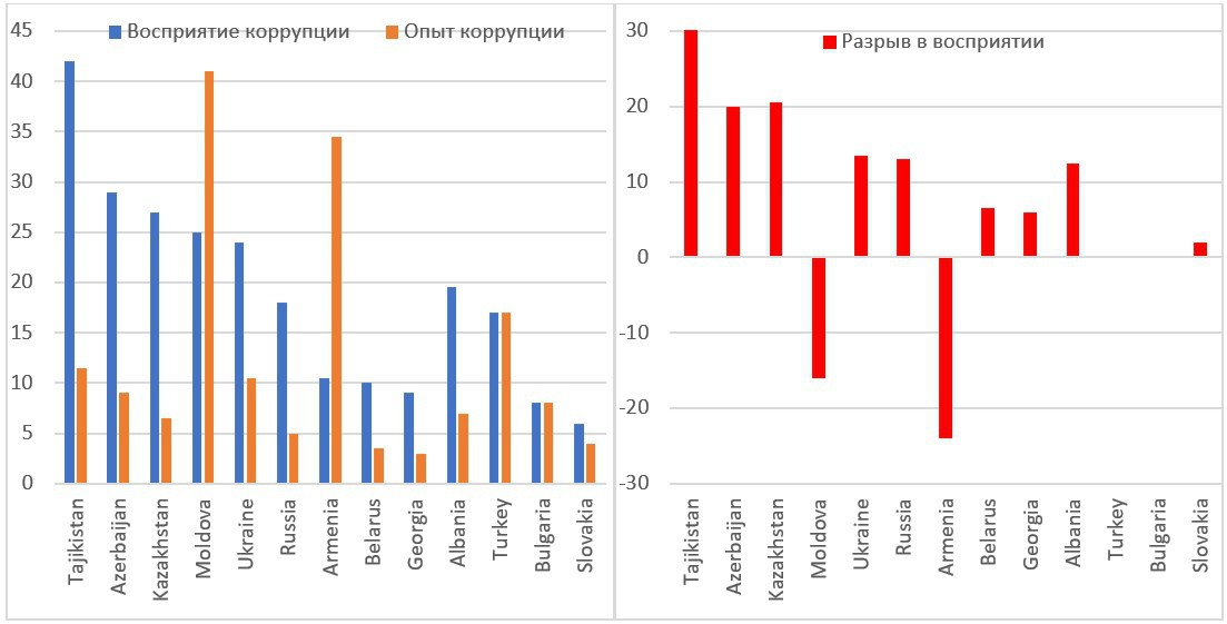 Примечание: разрыв в восприятии отражает то, насколько реальный коррупционный опыт преобладает над воспринимаемым уровнем коррупции.