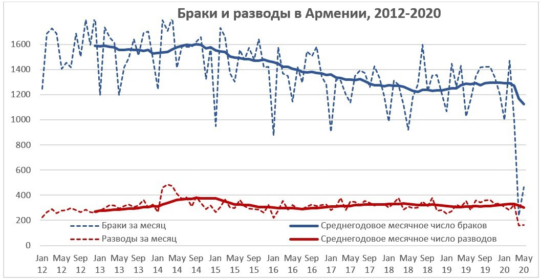 За период пандемии резко сократилось количество браков в стране. Это вызвано не возрастными или какими-либо прочими структурными причинами, а техническими ограничениями, собственно карантином, а также кампанией порицания в соцсетях. Также можно вспомнить, как глава Генштаба Армении Артак Давтян был отправлен в отставку после того как его сын провел свадьбу на 100 человек в начале июня. Правда, имеющаяся статистика ограничивается маем 2020 года, но и тогда сокращение было значительным.
