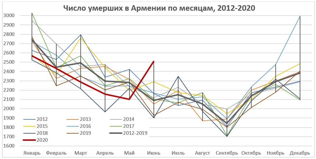 Однако на сегодня, естественно, самое интересное – смертность и в том числе избыточная смертность, связанная с пандемией. В данном посте я не буду делать этой оценки, поскольку точных данных нет, а доступные – приблизительны и предварительны. Но возможно, такую оценку сделаю в дальнейшем. Армстат уже опубликовал количество умерших в апреле-мае 2020 года. За июнь данных пока что нет, кроме тех, что представлены премьером Николом Пашиняном. К сожалению, нет точной цифры, но он заявил, что в июне 2020 года умерших было на 30% больше, чем в июне 2019 года. Поскольку в июне 2019 их было 1,929, то в июне 2020 их, скорее всего, было 2,508 (хотя возможны небольшие отклонения в ту или иную сторону). Вот так выглядит эта динамика по месяцам.
