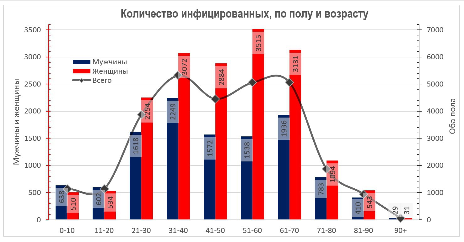 Данные, полученные по запросу, я дополнил открытыми данными, в результате чего у нас есть статистика по 731 умершему, из которых 572 – умершие от коронавируса по состоянию на 11 июля и 159 – умершие с коронавирусом по состоянию на 5 июля. Суммарно это выглядит следующим образом.