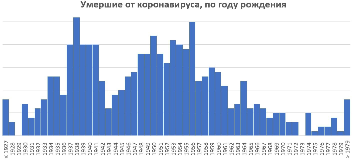 Как мы видим, есть явный провал по родившимся в годы Великой отечественной войны, что связано с низкой рождаемостью в этот период. Это обстоятельство также приводит к более низкой по сравнению со средней базой смертности в 2020 году.
