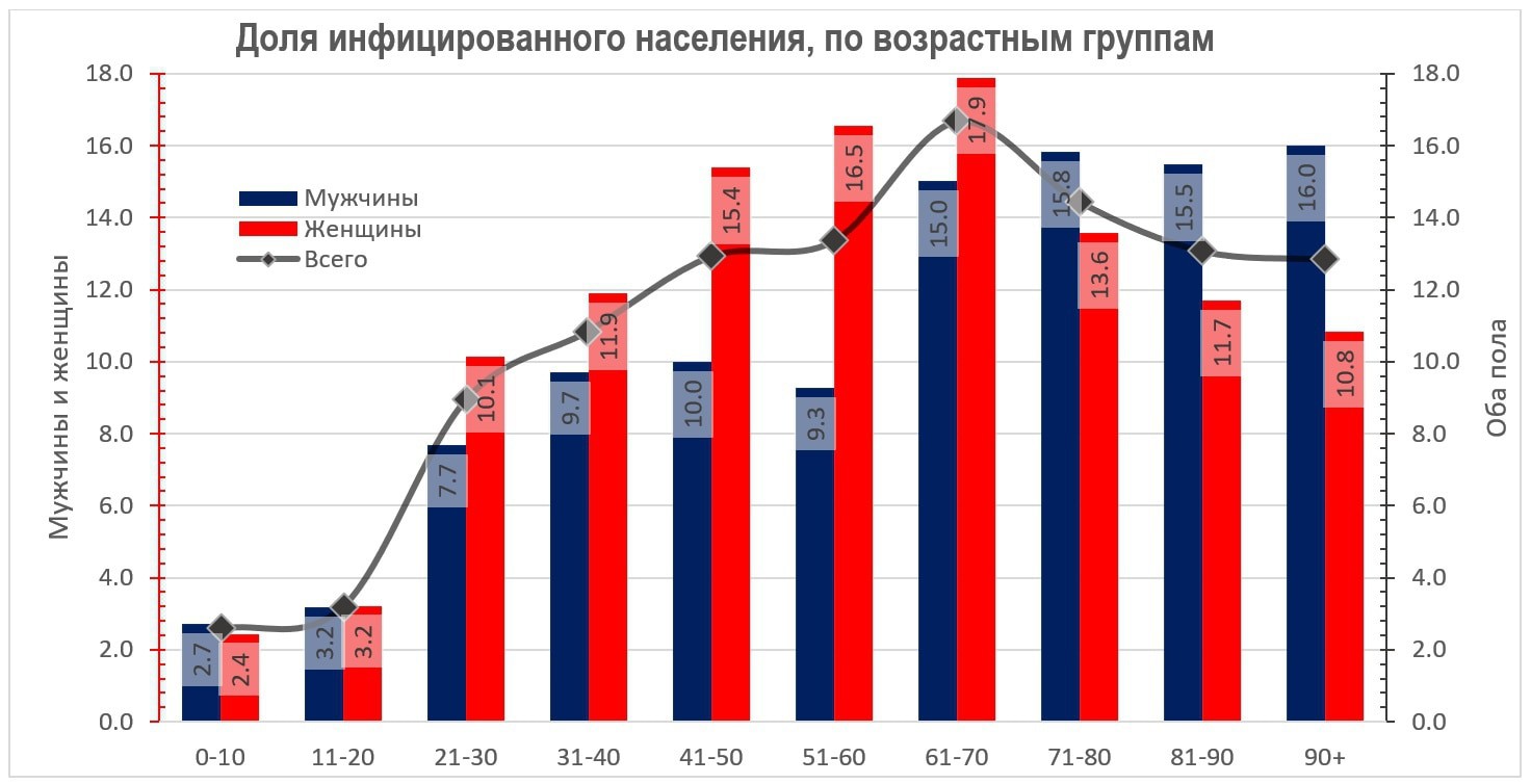 По этим причинам, к сожалению, мы не можем сказать, что эту возрастную структуру можно без изменений экстраполировать на общее число инфицированных, которое мы можем предполагать в размере существенно более 100 тысяч к текущему моменту. Рассмотрим возрастную структуру инфицированных в пропорции к числу инфицированных.