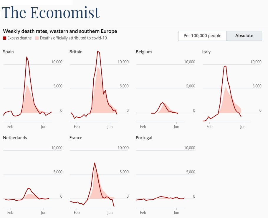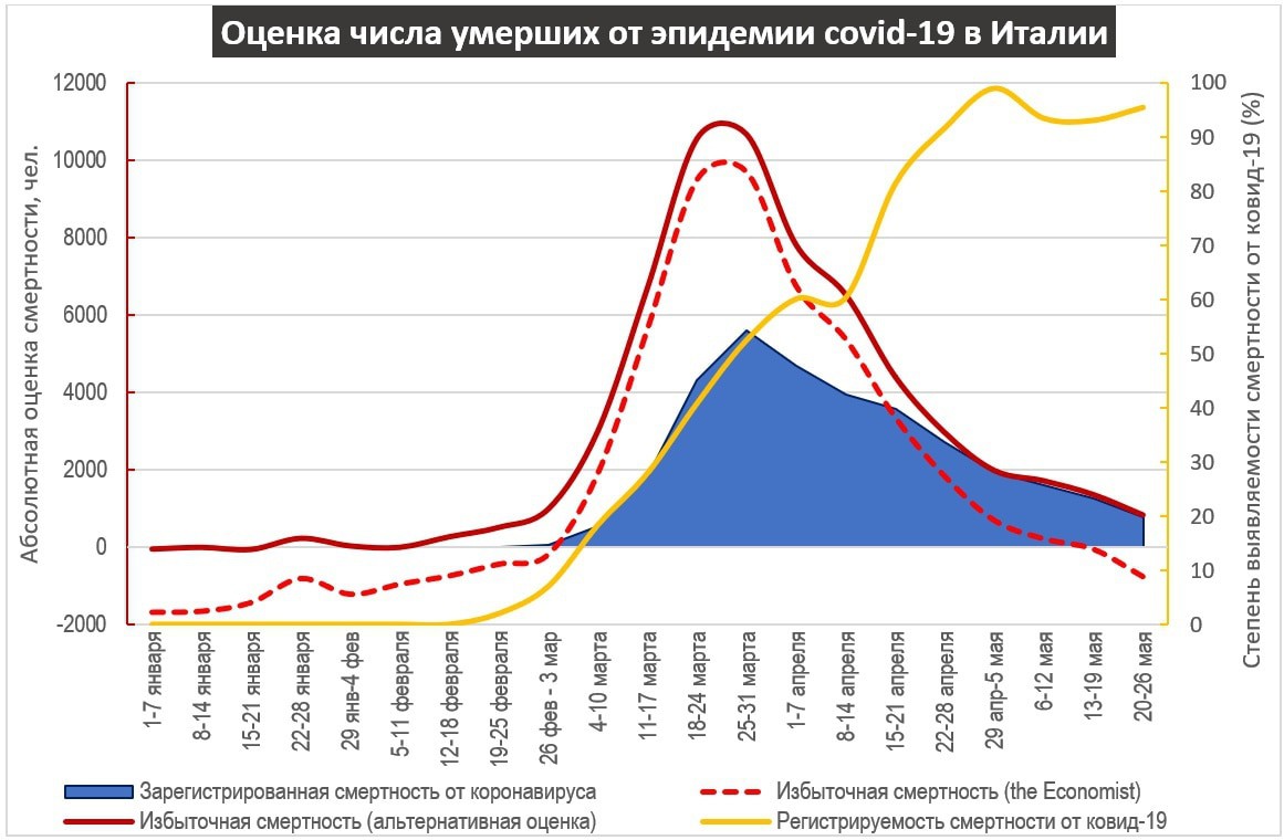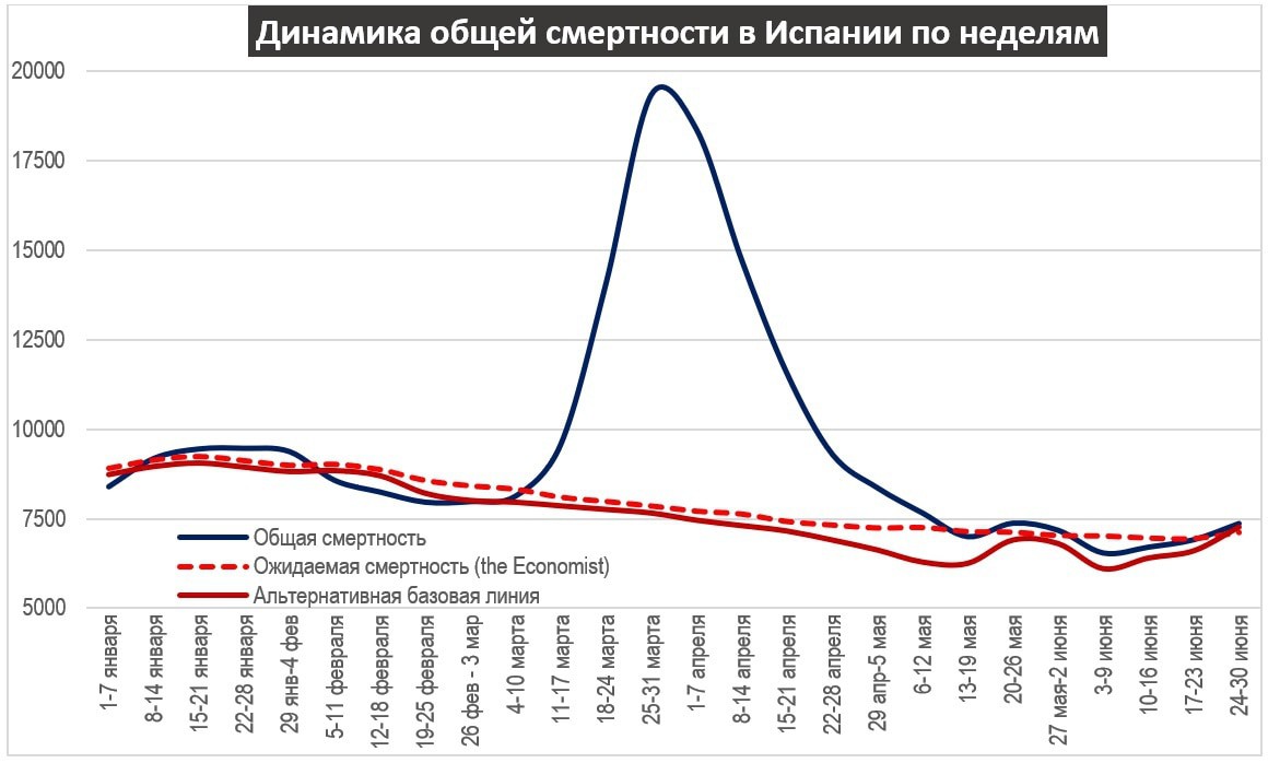 В дальнейшем регистрационные данные Испании анализу не поддаются. Они регулярно снижали оценку количества, а также публиковали цифры, близкие к нулю. Учитывая, что до нынешнего момента эпидемия в Испании пока еще не очень значительна, оценку в 50+ тыс. погибших можно считать актуальной и сейчас. Что касается оценки журнала «Экономист» - ну нельзя считать отрицательную избыточную смертность; избыточная смертность также не может быть ниже зарегистрированной. Благодаря ковиду, люди пока еще не начали воскресать, а только тогда можно было бы иметь отрицательную избыточную смертность, да еще и суммировать ее с положительной.