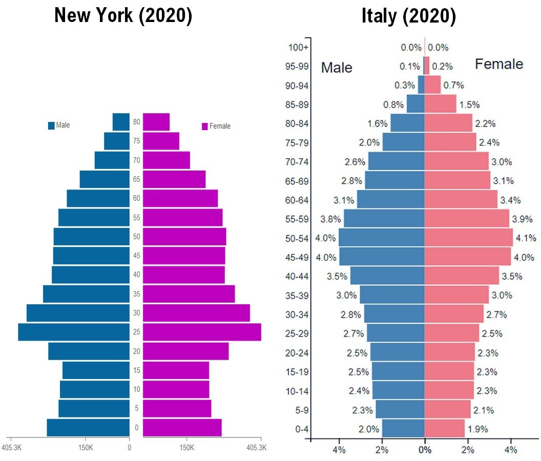 Рис. 17. Сопоставление половозрастных пирамид Нью-Йорка и Италии на 2020 год