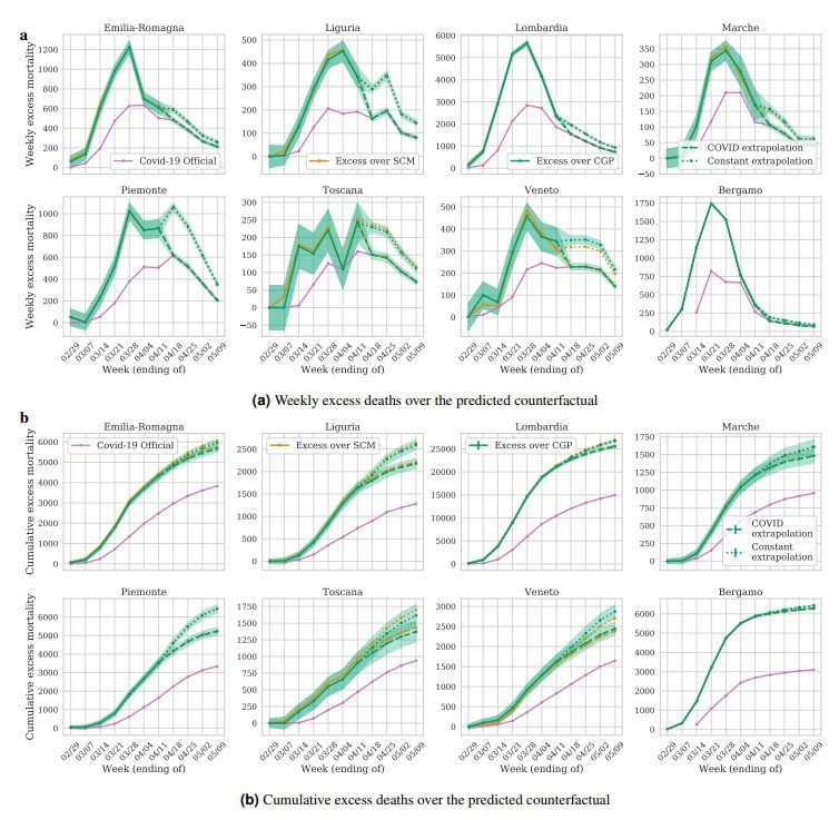 В уже упомянутой статье How deadly is COVID-19? A rigorous analysis of excess mortality and age-dependent fatality rates in Italy приводятся также оценки избыточной смерти по регионам Италии, они довольно близки к вышеприведенным с той поправкой, что в моих подсчетах на основании месячных данных избыточная смертность за февраль вероятно завышена, а в их подсчетах, вероятно, занижена (ее почти нет), и также конечная дата разнится – 9 мая у коллектива авторов и 31 мая у меня. В остальном, расхождений не вижу.