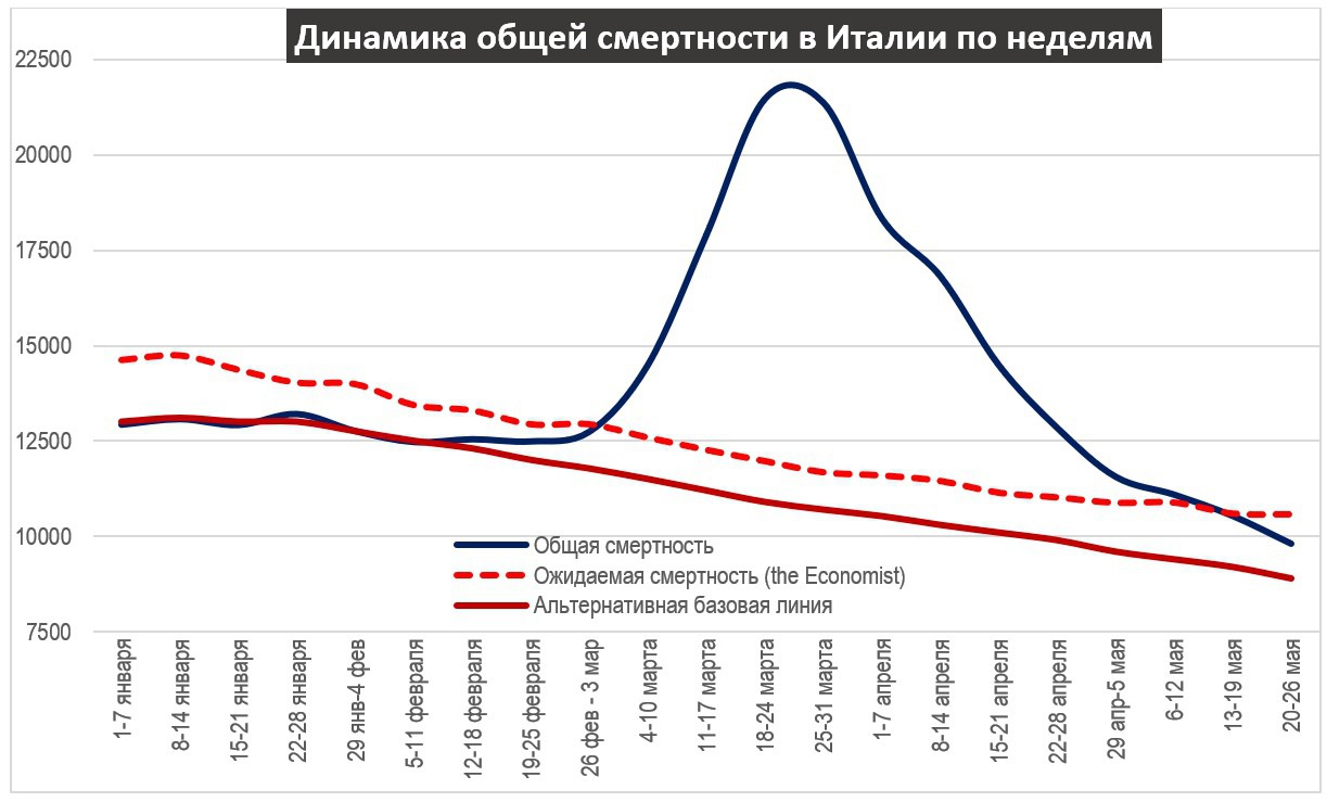 По их оценке, избыточная смертность в Италии в период с 26 февраля по 26 мая составила 43,945 человек при 32,955 чел. зарегистрированных умерших от коронавируса за то же время. Таким образом, по их оценке, помимо 33 тысяч зарегистрированных умерших, было еще 11 тысяч, которых не зарегистрировали. На графике мы можем увидеть, что выбрана не вполне адекватная база для сравнения. Рассмотрим понедельную динамику.
