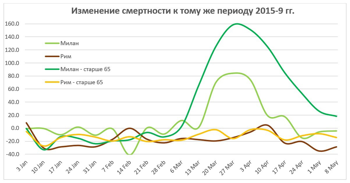 Рис. 6. Динамика избыточной смертности в Риме и Милане