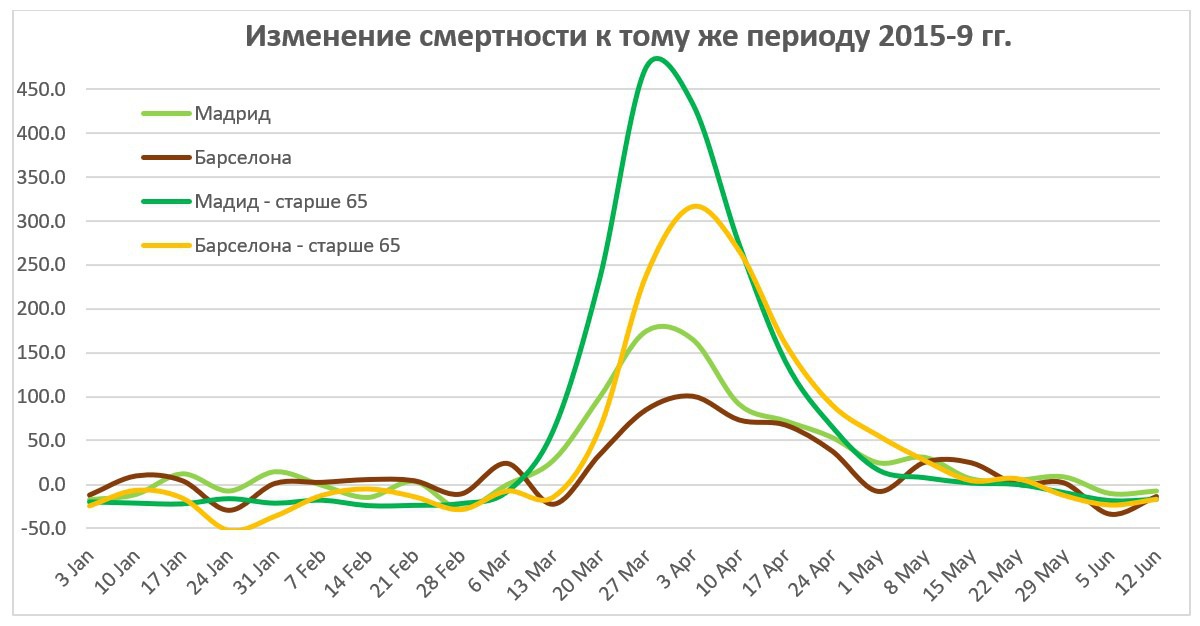 Рис. 9. Динамика избыточной смертности в Мадриде и Барселоне