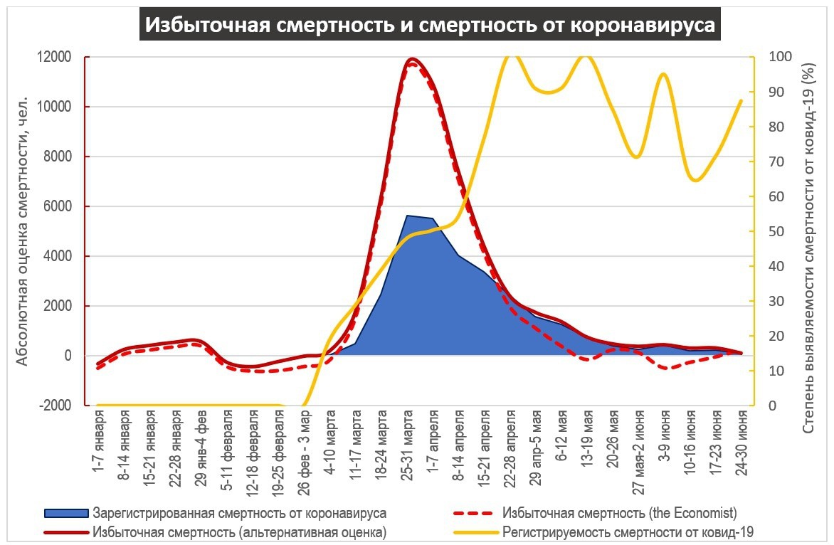 Альтернативная оценка, как и прежде, основана как на ожидаемой (средней за прошлые годы), так и на основе реально зафиксированной, в конце эпидемии в частности, оценим избыточную смертность, степень регистрируемости и другие показатели.