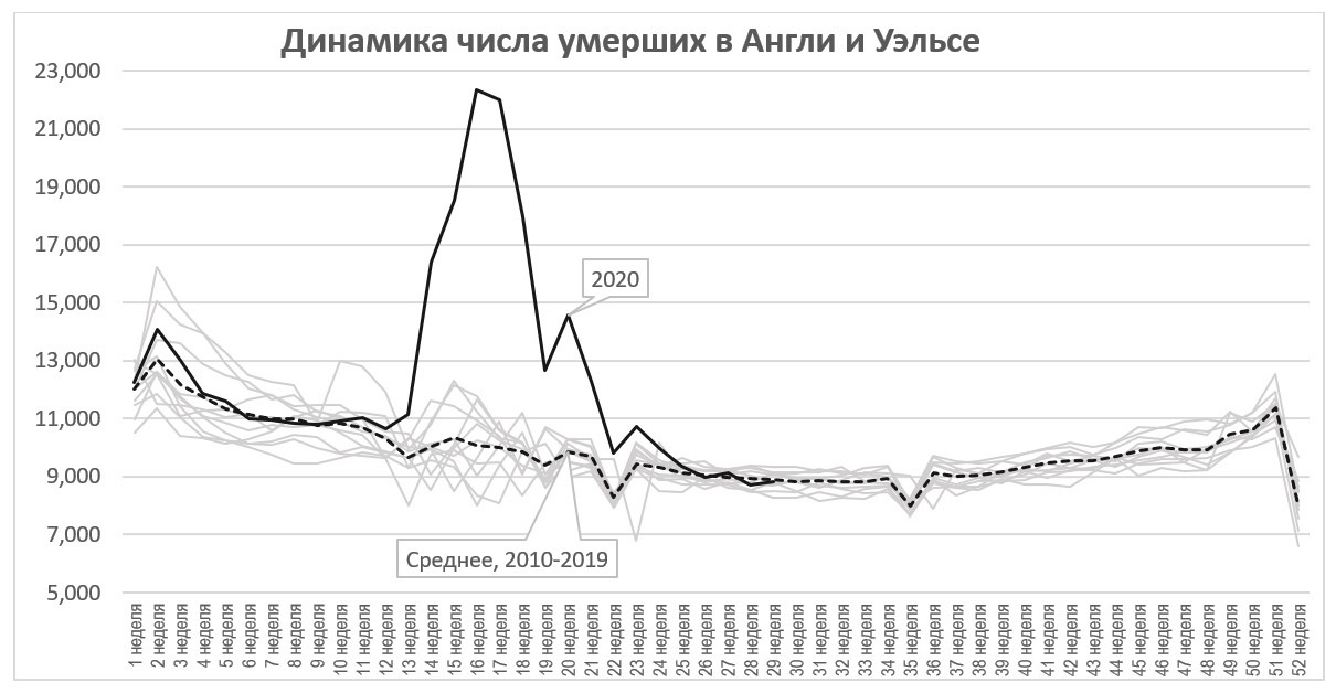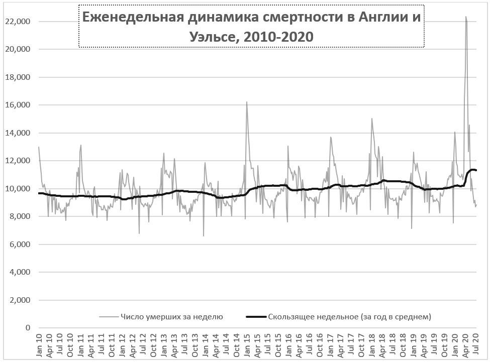 В апреле в мировые «лидеры» по распространению Covid-19 вырвалась Великобритания, где изначально премьер Борис Джонсон придерживался концепции коллективного иммунитета, но позже сменил свою позицию на необходимость карантина, так как столкнулся с твердой оппозицией из континентальной Европы, в частности, Франции. Но время было упущено и вирус распространился по Великобритании, а вскоре и сам Джонсон довольно тяжело переболел коронавирусом. Доступны данные по смертности в Великобритании в последние 10 лет.