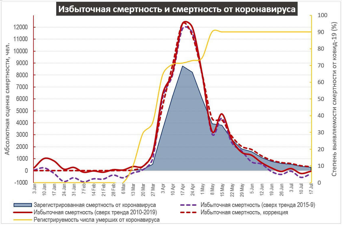 Итак, количество умерших, где в качестве причины смерти указан коронавирус, за весь период составляет 50,799. В период с 29 февраля по 17 июля число избыточных смертей сверх тренда 2015-9 гг. составляет 57,307. Если исключить периоды, когда зафиксирована отрицательная свехсмертность, это временные рамки с 14 марта по 18 июня, где избыточная смертность составляет уже 59,345 и еще 4,438 зарегистрированных умерших в периоды, когда по этой базовой линии избыточная смертность является отрицательной. Суммарно это составляет 63,783. В действительности, адекватной базой является тренд 2010-2019 гг., а с коррекцией на колебания и на поздней фазе эпидемии избыточная смертность составляет 67,151, что следует отнести к коронавирусу, из которых смерть 5,231 была ускорена коронавирусом на короткий период (около 3 месяцев), что приводит к отрицательной избыточной смертности относительно зарегистрированной еще с конца мая. Таким образом, в период пандемии избыточная смертность составила 61,920 человек и еще 5,231 человек из числа тех, что умерли бы в период пандемии, но позже, скончались на ее пике или в ранней фазе. Из общего числа умерших, 75.7% были зарегистрированы как умершие от ковид, а 24.3% - нет, но недорегистрация фиксировалась преимущественно в начальной фазе эпидемии.